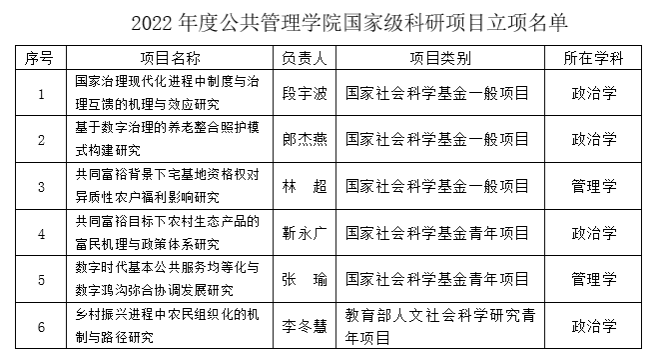 近年来,我院度重视国家级科研项目申报工作,每年及时对项目申报工作进行充分动员,并对项目申报工作提供精准指导和服务。今年李冬慧博士获批教育部人文社科青年项目1项,至此我院2022年共获批国家级科研项目6项。我院在国家级科研项目立项上取得重要突破,必将有力推动全院科研实力大幅提升,促进公共管理必发集团提档升级。