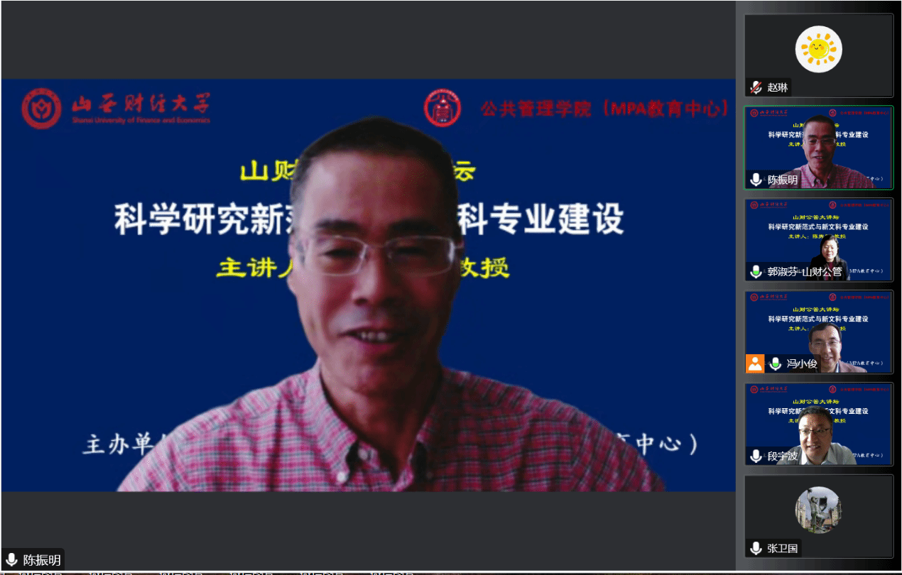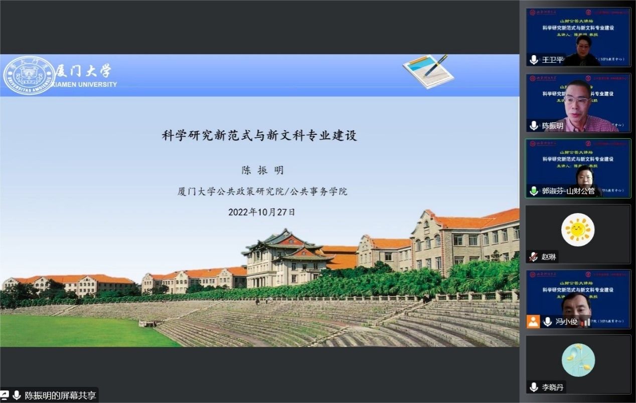 2022年10月27日,由7790cnm必发集团主办的“山财公管大讲坛”正式开讲,厦门大学公共政策研究院教授兼院长、厦门大学社会科学学部主任、“长江学者”特聘教授陈振明拨冗莅临第一讲做了题为“科学研究新范式与新文科专业建设”的报告。校党委副书记、公共管理一级学科带头人王卫平教授主持了本次大讲坛。来自校内外的300余名师生线上聆听了报告。