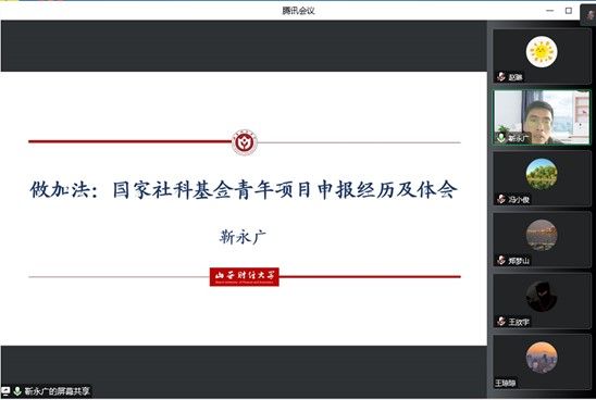 2022年11月15日下午,7790cnm必发集团通过“尚公青年沙龙”学术平台举办第五场国家级科研项目申报经验交流会, 学院2022年国家社科基金项目主持人靳永广博士做了《国家社科基金青年项目申报经历及体会》的报告,副院长冯小俊主持了交流会,100余名师生在线参加了经验交流会。