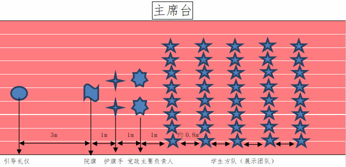 (1)学院(研究院)按序列排列,每个学院(研究院)导引礼仪在前,相隔3米为学院(研究院)旗,相隔1米为护旗人员2名,再相隔1米为学院(研究院)党政主要负责人(着正装),再相隔1米为学院(研究院)方队,学生在前,相隔1米为教职工代表(导引牌、旗由学生工作部负责)。